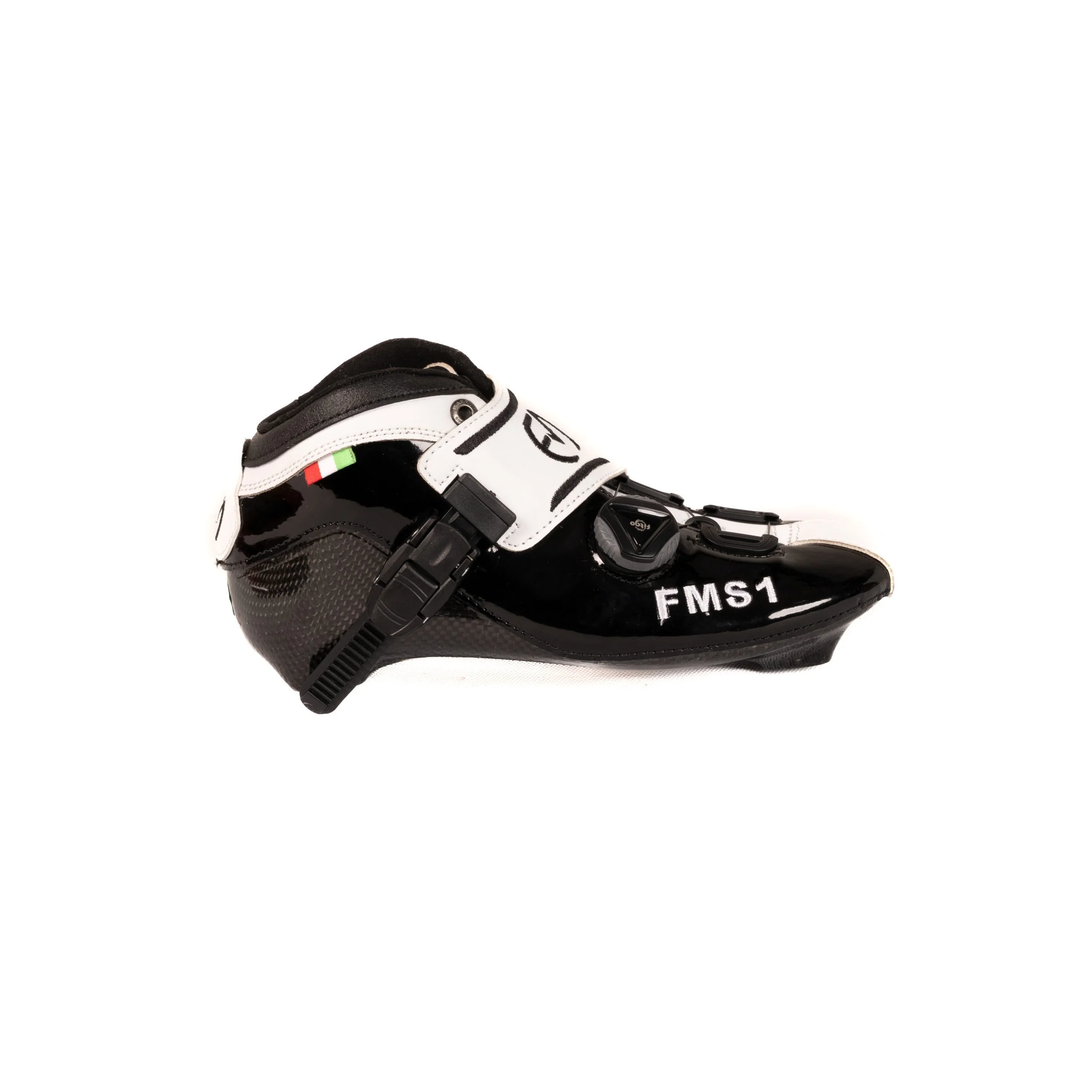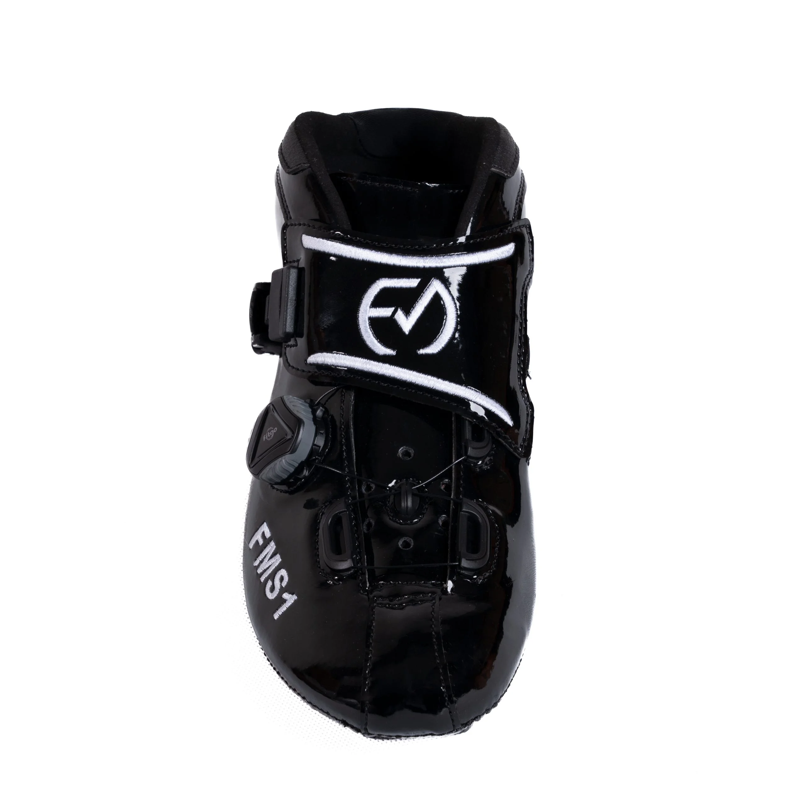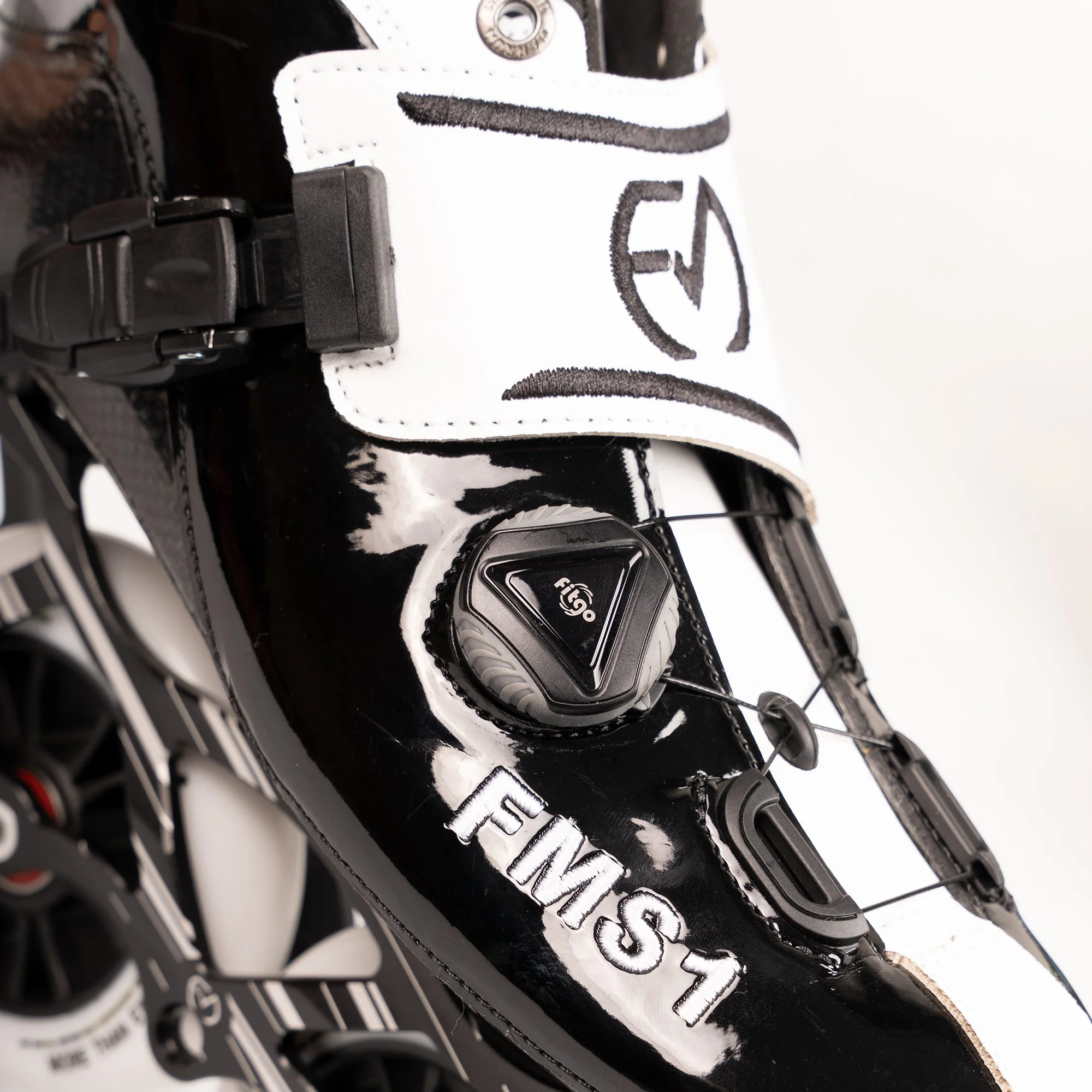 بوت FM‑S1 مشکی از فیبر کربن با روکش میکروفیبر ضدخش ساخته شده که علاوه بر استحکام بالا، ظاهری لوکس و ماندگار دارد. طراحی مشکی مات با خطوط نقرهای مینیمال، حس حرفهای بودن را القا میکند و درعینحال باعث میشود چرک و خط و خش سطحی کمتر به چشم بیاید. قالب داخلی بهگونهای طراحی شده که مچ و پاشنه پای اسکیتباز را در موقعیت درست نگه دارد و با کمترین فشار، حداکثر انتقال نیرو را به چرخها فراهم کند.